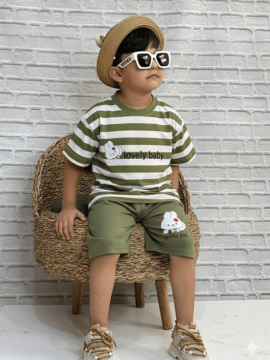 تیشرت شلوارک تابستانی بچگانه شامل تیشرت پنبهای نرم و ضد حساسیت همراه با شلوارک کتان خنک و مقاوم. طراحی فانتزی خرگوش بامزه در ۴ رنگ جذاب (زرد، صورتی، سبز، قهوهای). مناسب 2 تا 7 سال."